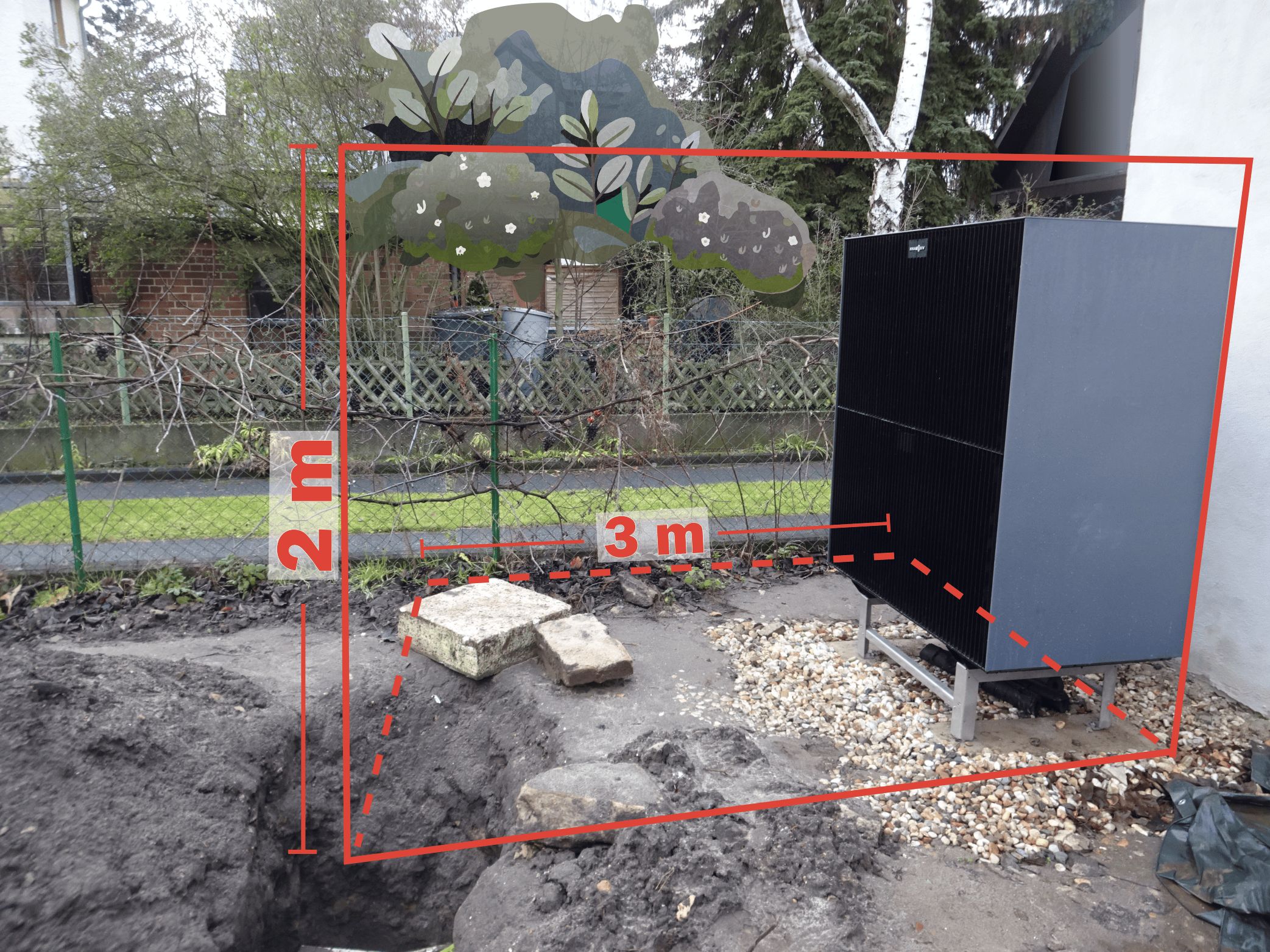 - Wärmepumpen einschließlich ihrer Fundamente und Einhausungen mit einer Höhe bis zu 2 Meter und einer Gesamtlänge je Grundstücksgrenze von 3 Meter